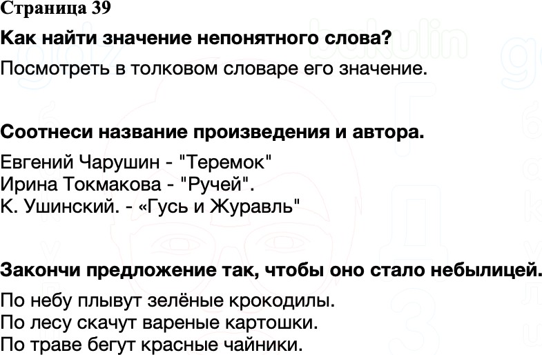 Правильный ответ к заданию ГДЗ Рабочая тетрадь литературное чтение 1 класс Бойкина, Виноградская к учебнику Климанова, Горецкий Школа России