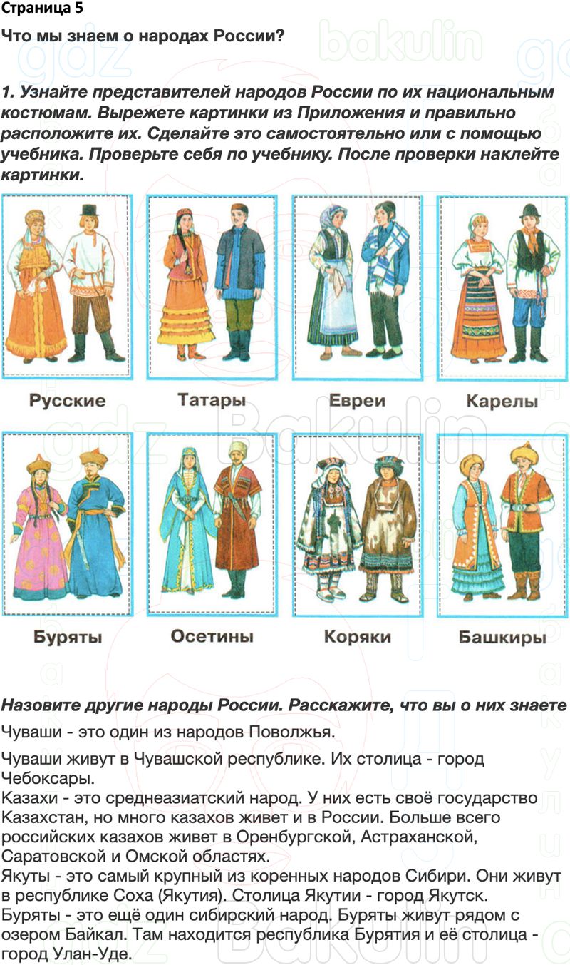 - Узнайте представителей народов России по их национальным костюмам. Вырежете картинки из Приложения и правильно расположите их. Сделайте это самостоятельно или с помощью учебника. Проверьте себя по учебнику. После проверки наклейте картинки.