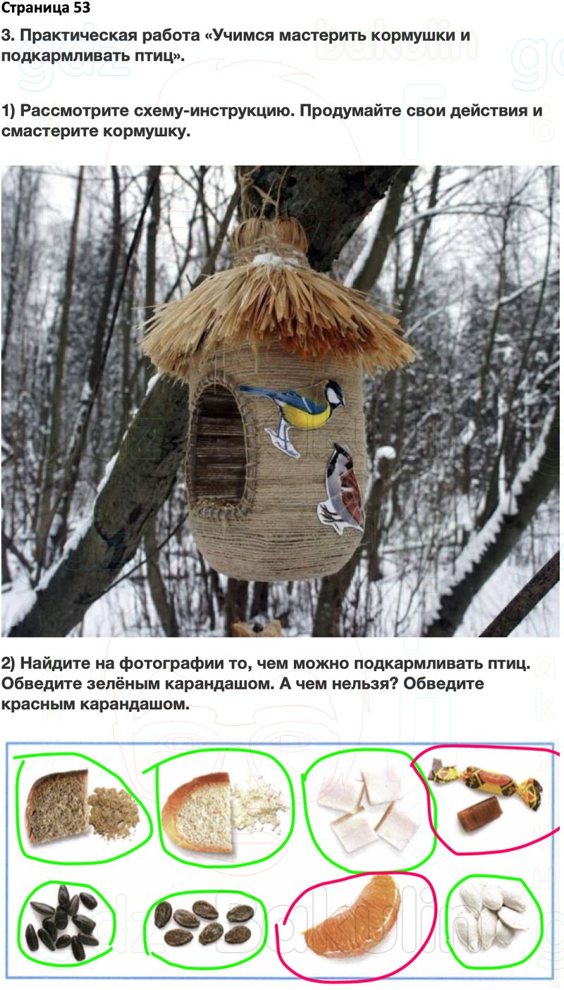 2) Найдите на фотографии то, чем можно подкармливать птиц. Обведите зелёным карандашом. А чем нельзя? Обведите красным карандашом.