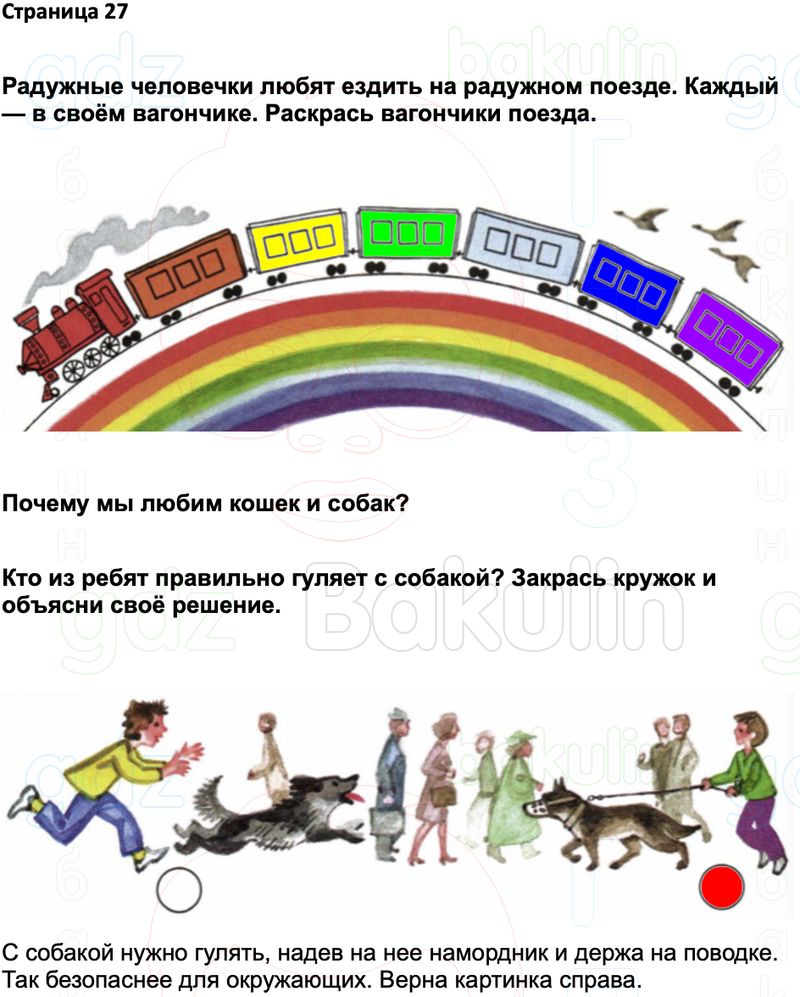 Кто из ребят правильно гуляет с собакой? Закрась кружок и объясни своё решение.