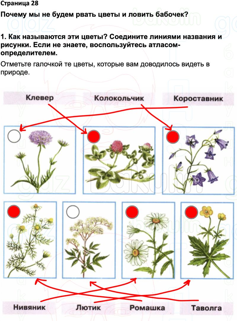 1. Как называются эти цветы? Соедините линиями названия и рисунки. Если не знаете, воспользуйтесь атласом-определителем.