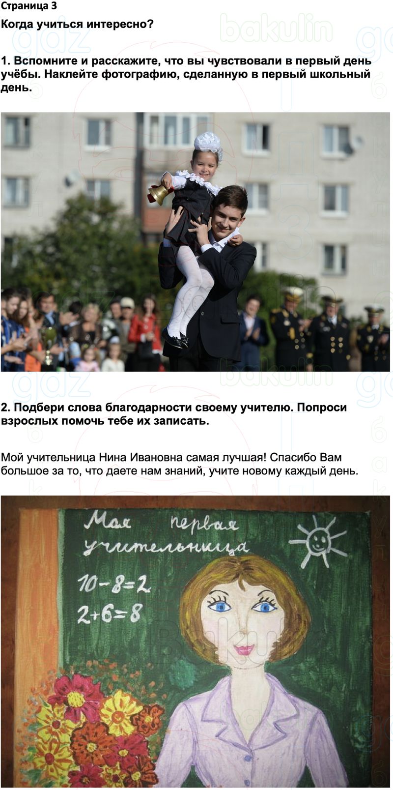 1. Вспомните и расскажите, что вы чувствовали в первый день учёбы. Наклейте фотографию, сделанную в первый школьный день.