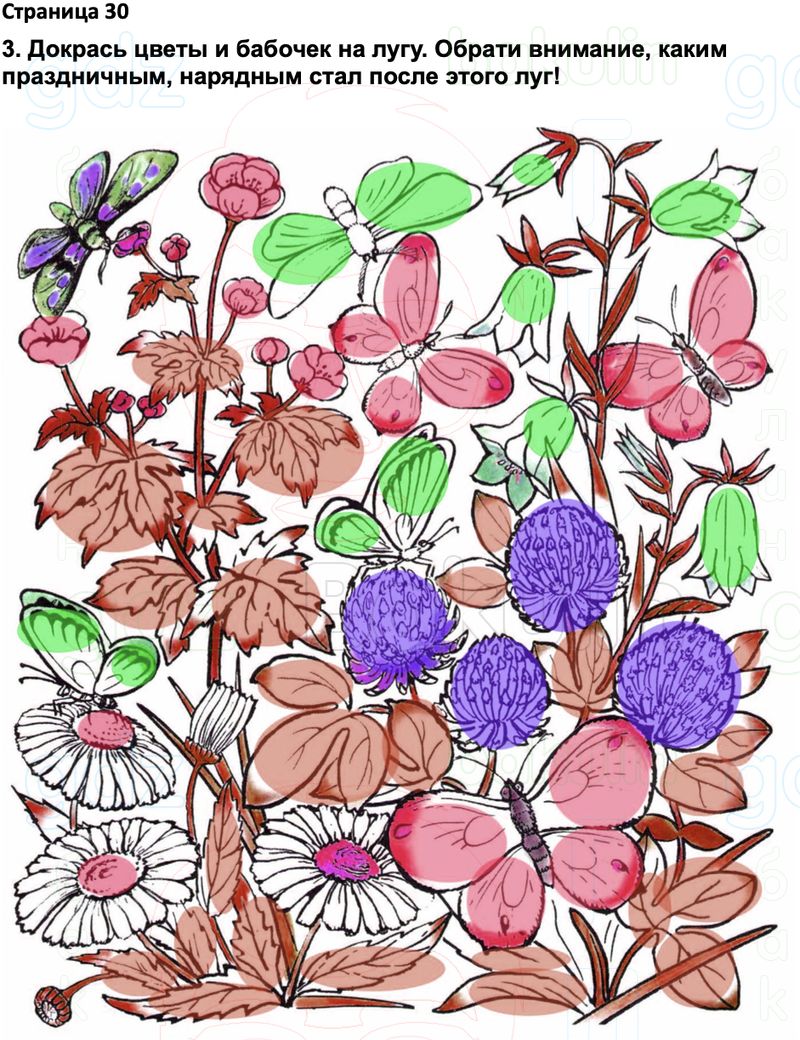 3. Докрась цветы и бабочек на лугу. Обрати внимание, каким праздничным, нарядным стал после этого луг!