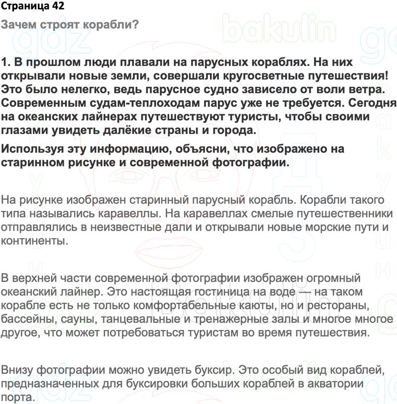 1. В прошлом люди плавали на парусных кораблях. На них открывали новые земли, совершали кругосветные путешествия! Это было нелегко, ведь парусное судно зависело от воли ветра. Современным судам-теплоходам парус уже не требуется. Сегодня на океанских лайнерах путешествуют туристы, чтобы своими глазами увидеть далёкие страны и города.