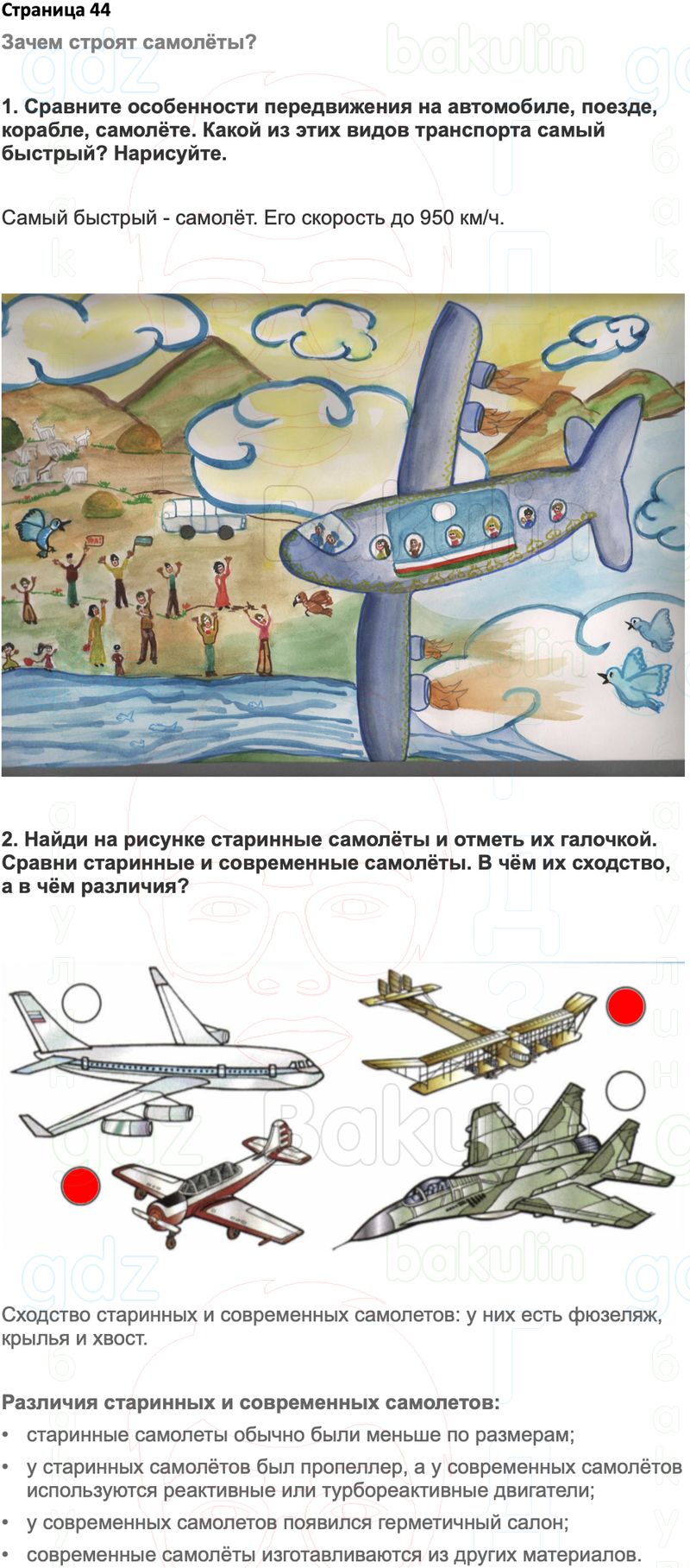 1. Сравните особенности передвижения на автомобиле, поезде, корабле, самолёте. Какой из этих видов транспорта самый быстрый? Нарисуйте.