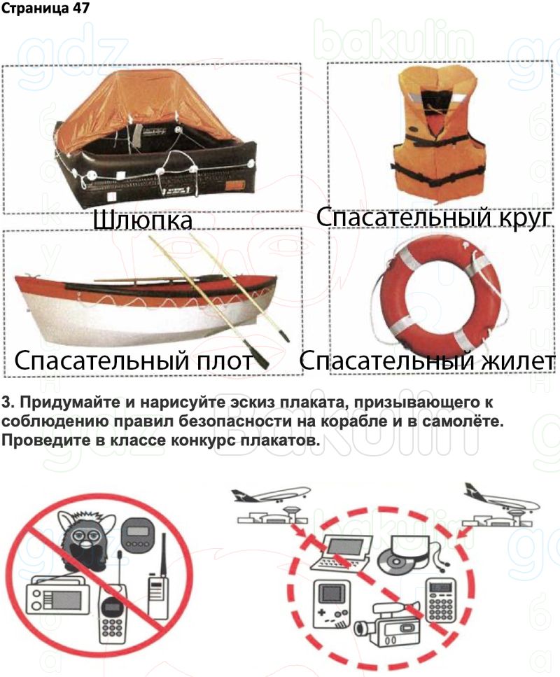 3. Придумайте и нарисуйте эскиз плаката, призывающего к соблюдению правил безопасности на корабле и в самолёте. Проведите в классе конкурс плакатов.