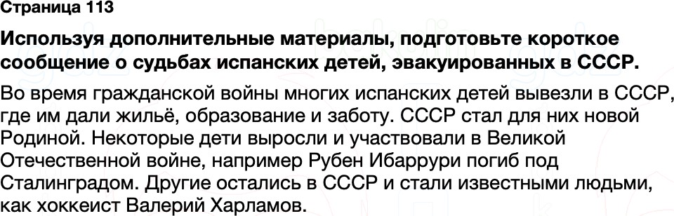 Используя дополнительные материалы, подготовьте короткое сообщение о судьбах испанских детей, эвакуированных в СССР.