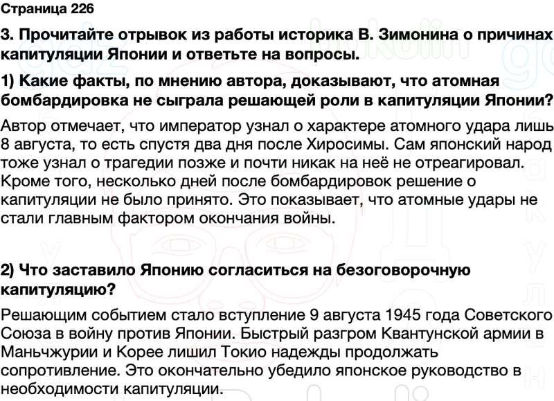 3. Прочитайте отрывок из работы историка В. Зимонина о причинах капитуляции Японии и ответьте на вопросы.