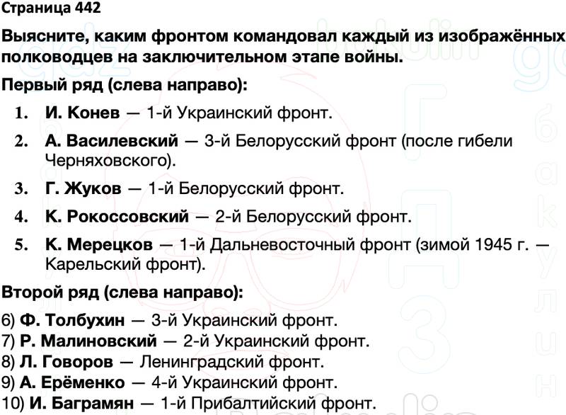 Выясните, каким фронтом командовал каждый из изображённых полководцев на заключительном этапе войны.