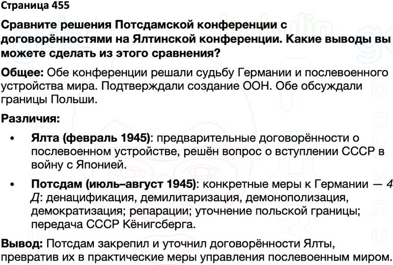 Сравните решения Потсдамской конференции с договорённостями на Ялтинской конференции. Какие выводы вы можете сделать из этого сравнения?