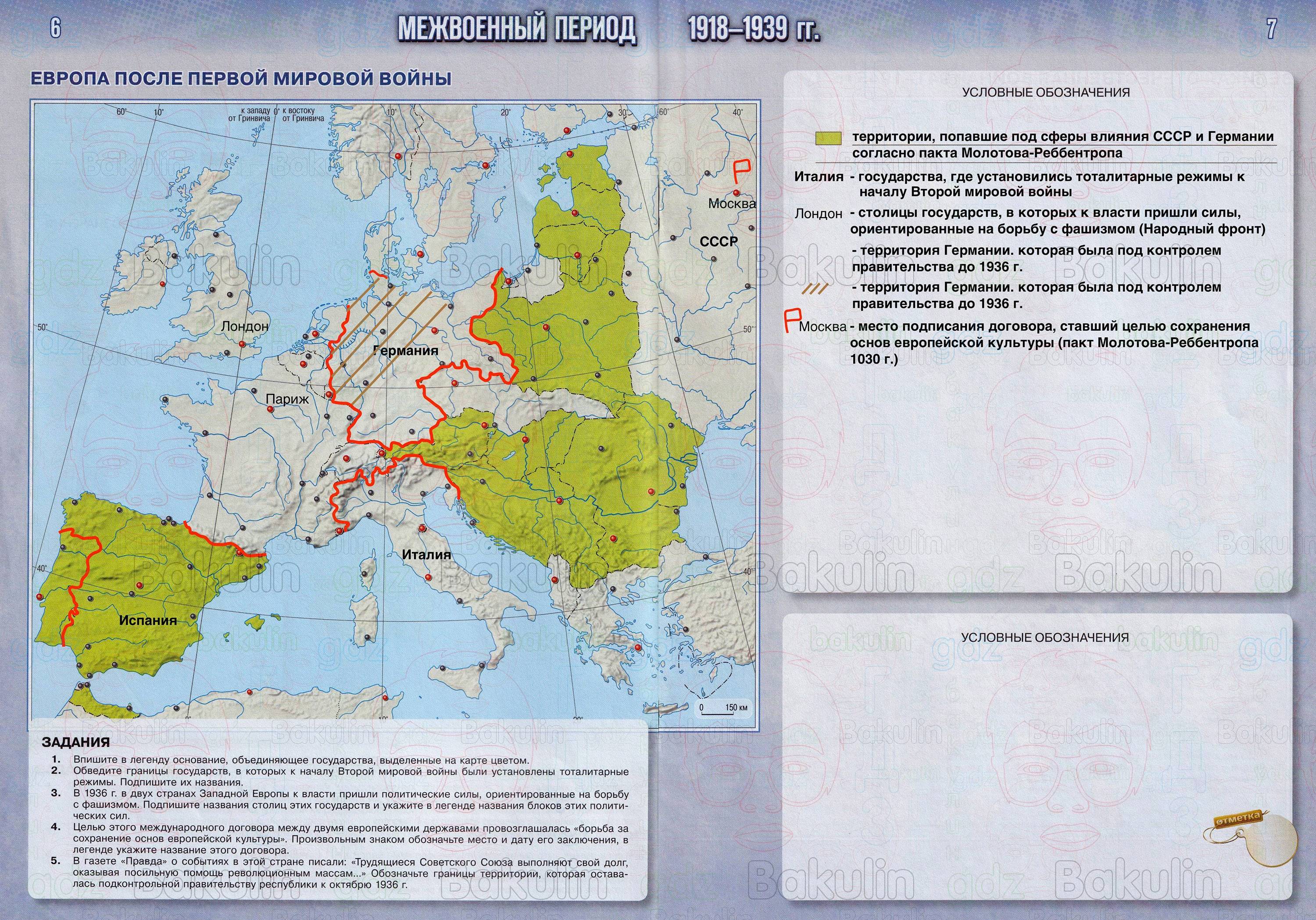 Страница 6-7 Контурная карта ЕВРОПА ПОСЛЕ ПЕРВОЙ МИРОВОЙ ВОЙНЫ. МЕЖВОЕННЫЙ ПЕРИОД 1918-1939 г.