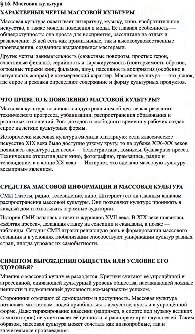 Краткое содержание пересказ Параграф 16. Массовая культура