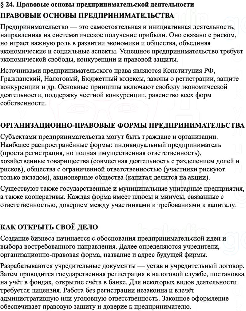 Краткое содержание пересказ Параграф 24. Правовые основы предпринимательской деятельности