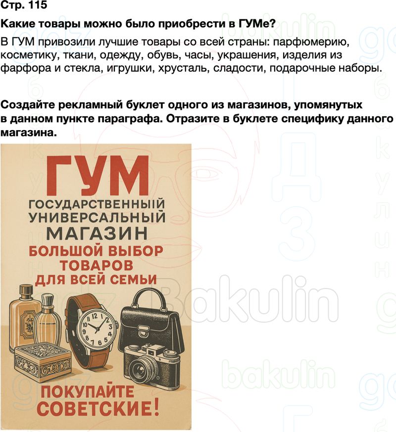 Какие товары можно было приобрести в ГУМе? Создайте рекламный буклет одного из магазинов, упомянутых в данном пункте параграфа. Отразите в буклете специфику данного магазина.