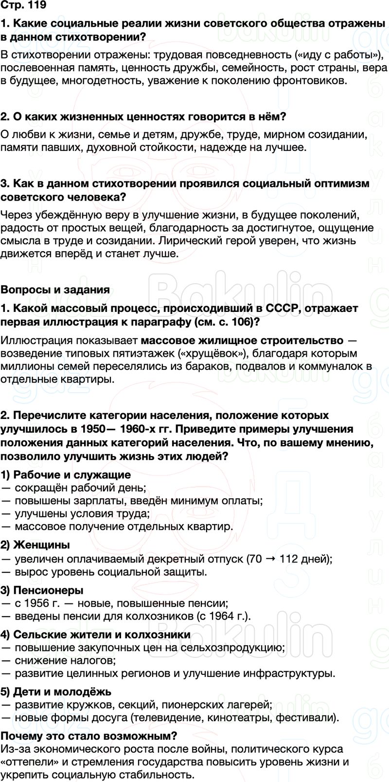 Какие социальные реалии жизни советского общества отражены в данном стихотворении? О каких жизненных ценностях говорится в нём? Как в данном стихотворении проявился социальный оптимизм советского человека? 1. Какой массовый процесс, происходивший в СССР, отражает первая иллюстрация к параграфу (см. с. 106)?