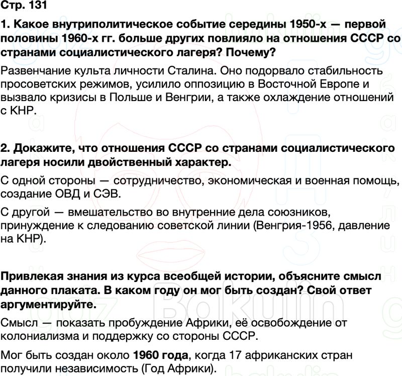 1. Какое внутриполитическое событие середины 1950-х — первой половины 1960-х гг. больше других повлияло на отношения СССР со странами социалистического лагеря? Почему?2. Докажите, что отношения СССР со странами социалистического лагеря носили двойственный характер. Привлекая знания из курса всеобщей истории, объясните смысл данного плаката. В каком году он мог быть создан? Свой ответ аргументируйте.