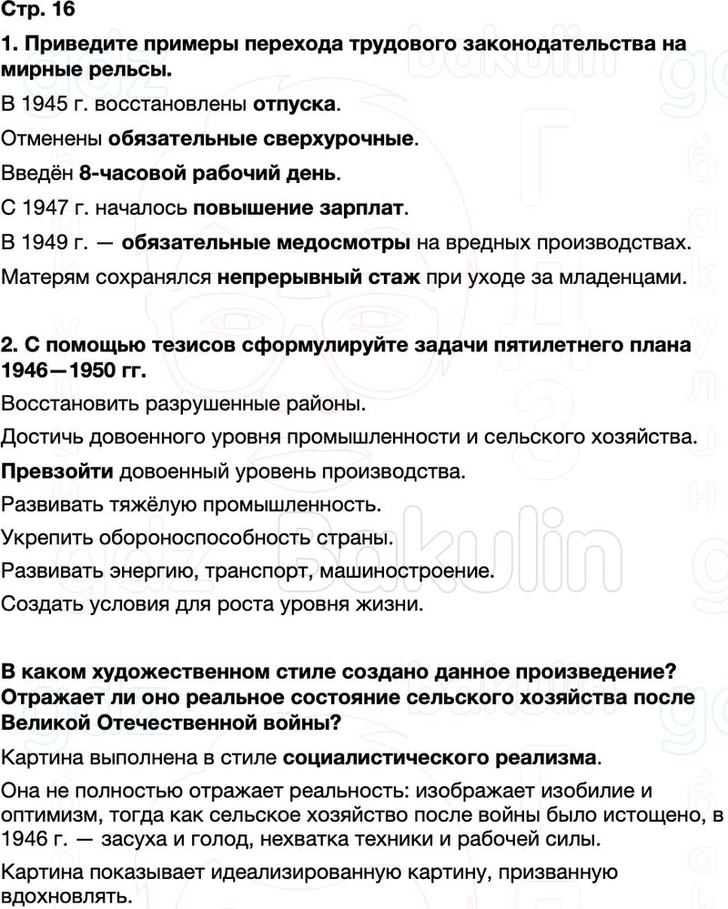 1. Приведите примеры перехода трудового законодательства на мирные рельсы. 2.С помощью тезисов сформулируйте задачи пятилетнего плана 1946—1950 rr В каком художественном стиле создано данное произведение? Отражает ли оно реальное состояние сельского хозяйства после Великой Отечественной войны?
