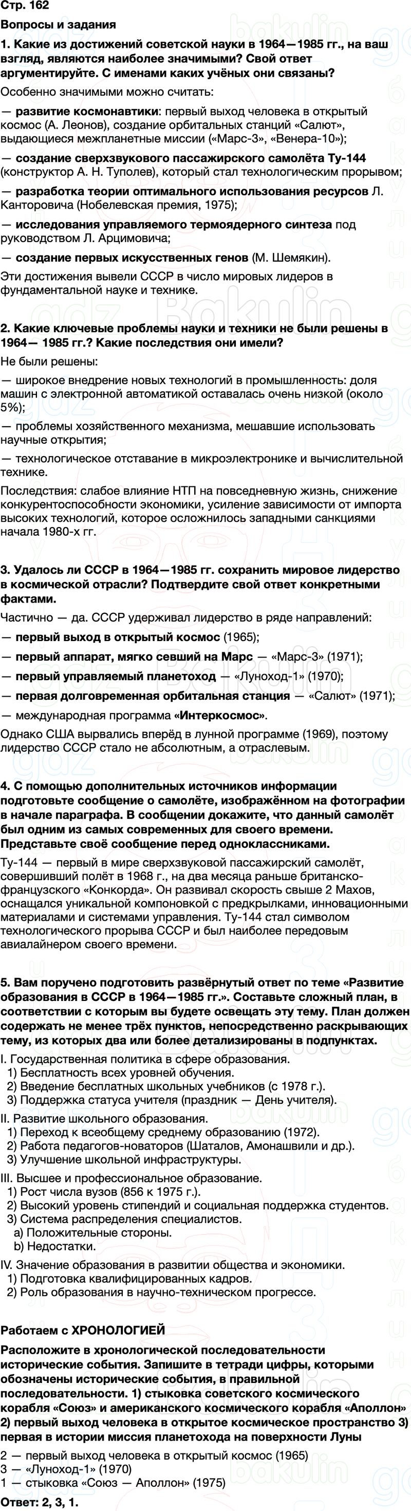 Удалось ли СССР в 1964—1985 гг. сохранить мировое лидерство в космической отрасли? Подтвердите свой ответ конкретными фактами. С помощью дополнительных источников информации подготовьте сообщение о самолёте, изображённом на фотографии в начале параграфа. В сообщении докажите, что данный самолёт был одним из самых современных для своего времени. Представьте своё сообщение перед одноклассниками.