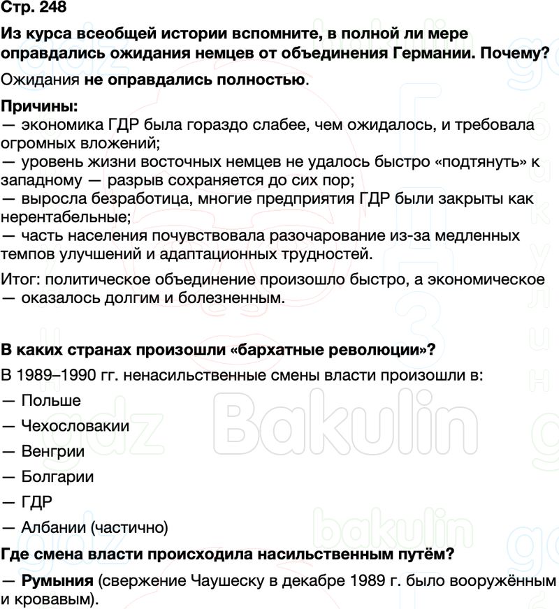 Из курса всеобщей истории вспомните, в полной ли мере оправдались ожидания немцев от объединения Германии. Почему? В каких странах произошли «бархатные революции»? Где смена власти происходила насильственным путём?