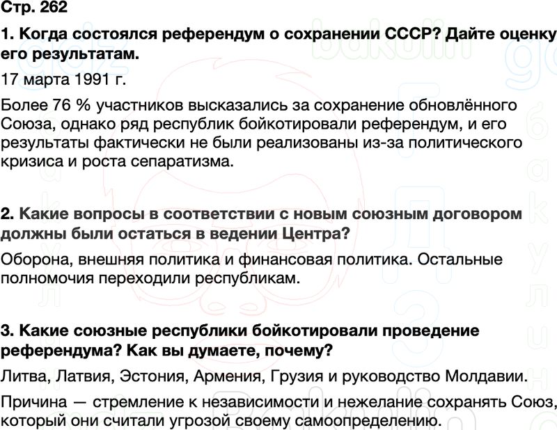 1. Когда состоялся референдум о сохранении СССР? Дайте оценку его результатам. 2. Какие вопросы в соответствии с новым союзным договором должны были остаться в ведении Центра? 3. Какие союзные республики бойкотировали проведение референдума? Как вы думаете, почему?