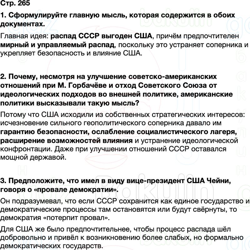 Сформулируйте главную мысль, которая содержится в обоих документах. 2. Почему, несмотря на улучшение советско-американских отношений при М. Горбачёве и отход Советского Союза от идеологических подходов во внешней политике, американские политики высказывали такую мысль? 3. Предположите, что имел в виду вице-президент США Чейни, говоря о «провале демократии».