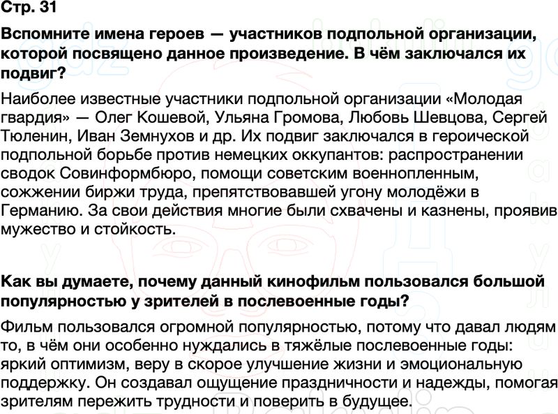 Вспомните имена героев — участников подпольной организации, которой посвящено данное произведение. В чём заключался их подвиг? Как вы думаете, почему данный кинофильм пользовался большой популярностью у зрителей в послевоенные годы?