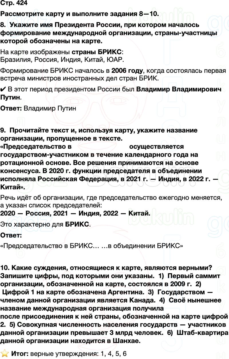 Укажите имя Президента России, при котором началось формирование международной организации, страны-участницы которой обозначены на карте." "Прочитайте текст и, используя карту, укажите название организации, пропущенное в тексте." "Какие суждения, относящиеся к карте, являются верными? Запишите цифры, под которыми они указаны.