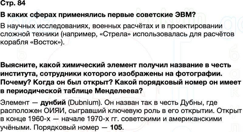 В каких сферах применялись первые советские ЭВМ?Выясните, какой химический элемент получил название в честь института, сотрудники которого изображены на фотографии. Почему? Когда он был открыт? Какой порядковый номер он имеет в периодической таблице Менделеева?