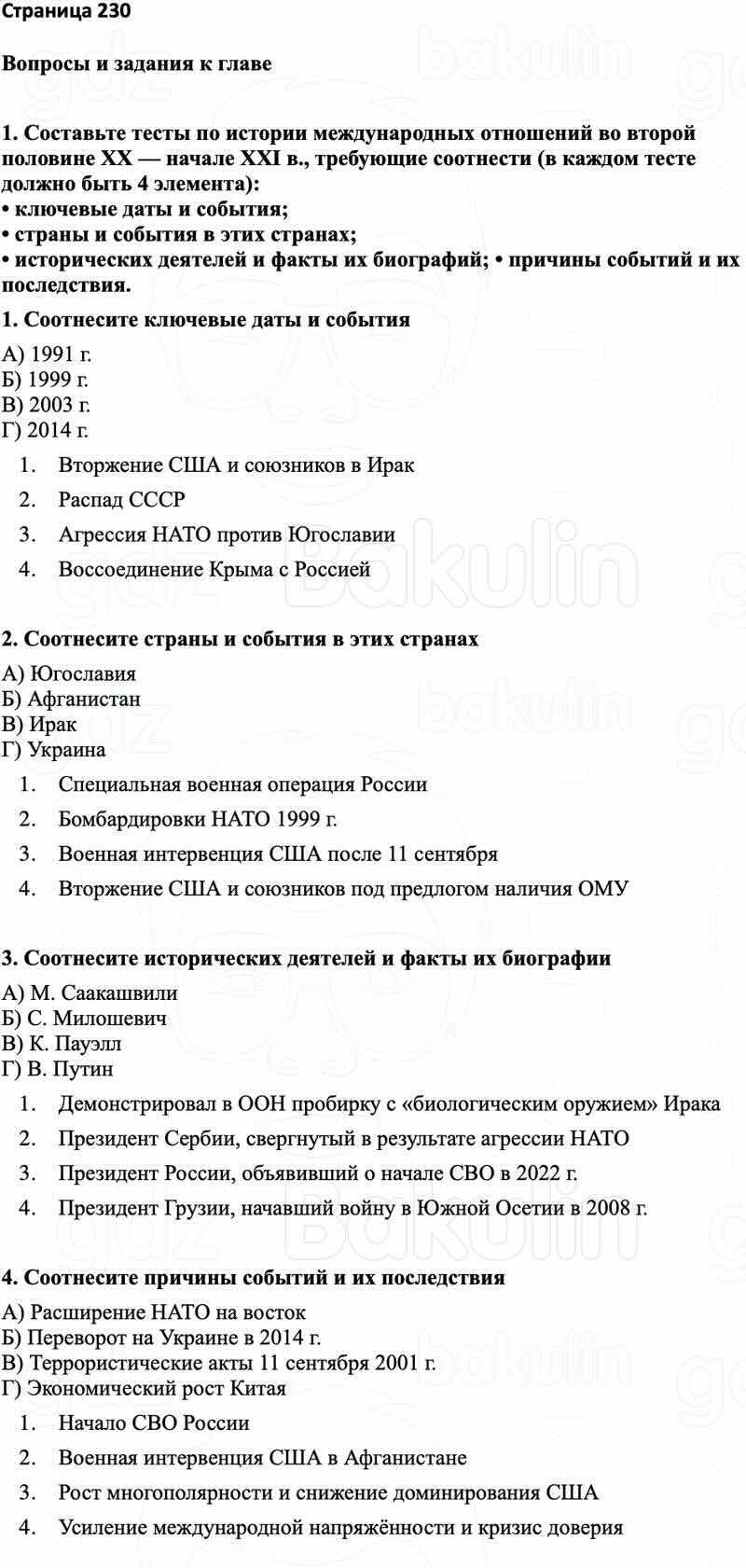 - Составьте тесты по истории международных отношений во второй половине ХХ — начале ХХI в., требующие соотнести (в каждом тесте должно быть 4 элемента):
