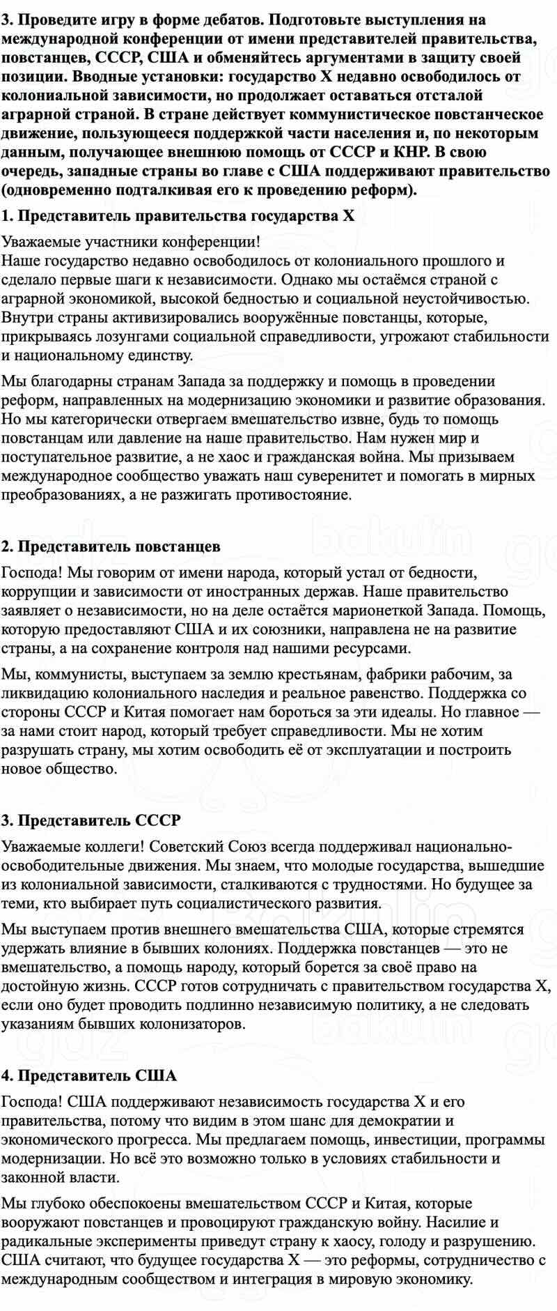 - Проведите игру в форме дебатов. Подготовьте выступления на международной конференции от имени представителей правительства, повстанцев, СССР, США и обменяйтесь аргументами в защиту своей позиции. Вводные установки: государство Х недавно освободилось от колониальной зависимости, но продолжает оставаться отсталой аграрной страной. В стране действует коммунистическое повстанческое движение, пользующееся поддержкой части населения и, по некоторым данным, получающее внешнюю помощь от СССР и КНР. В свою очередь, западные страны во главе с США поддерживают правительство (одновременно подталкивая его к проведению реформ).