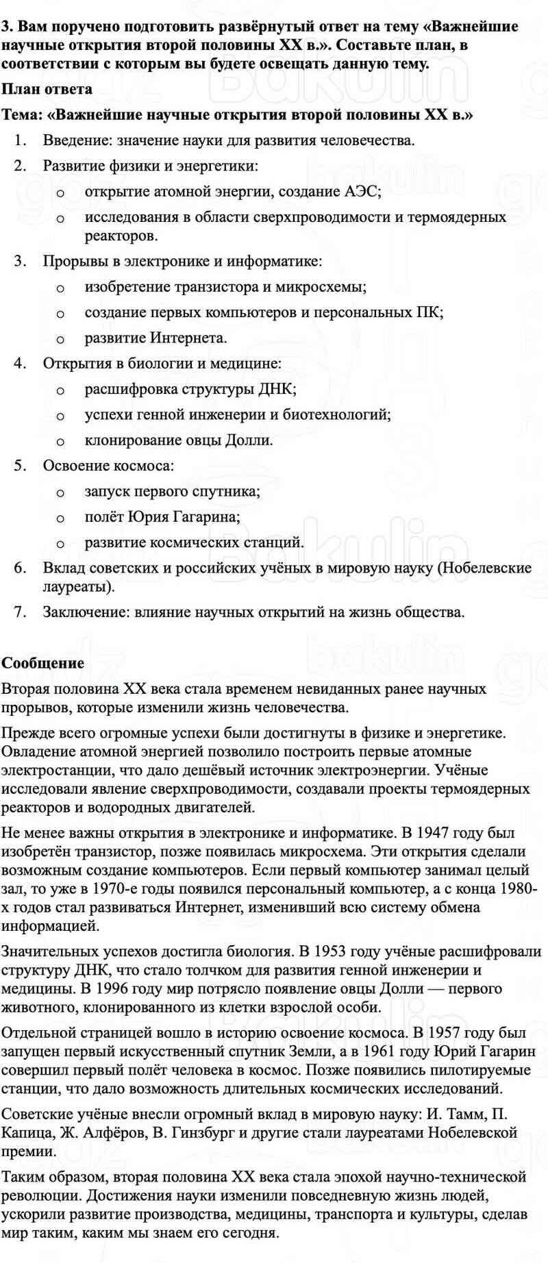 - Вам поручено подготовить развёрнутый ответ на тему «Важнейшие научные открытия второй половины ХХ в.». Составьте план, в соответствии с которым вы будете освещать данную тему.