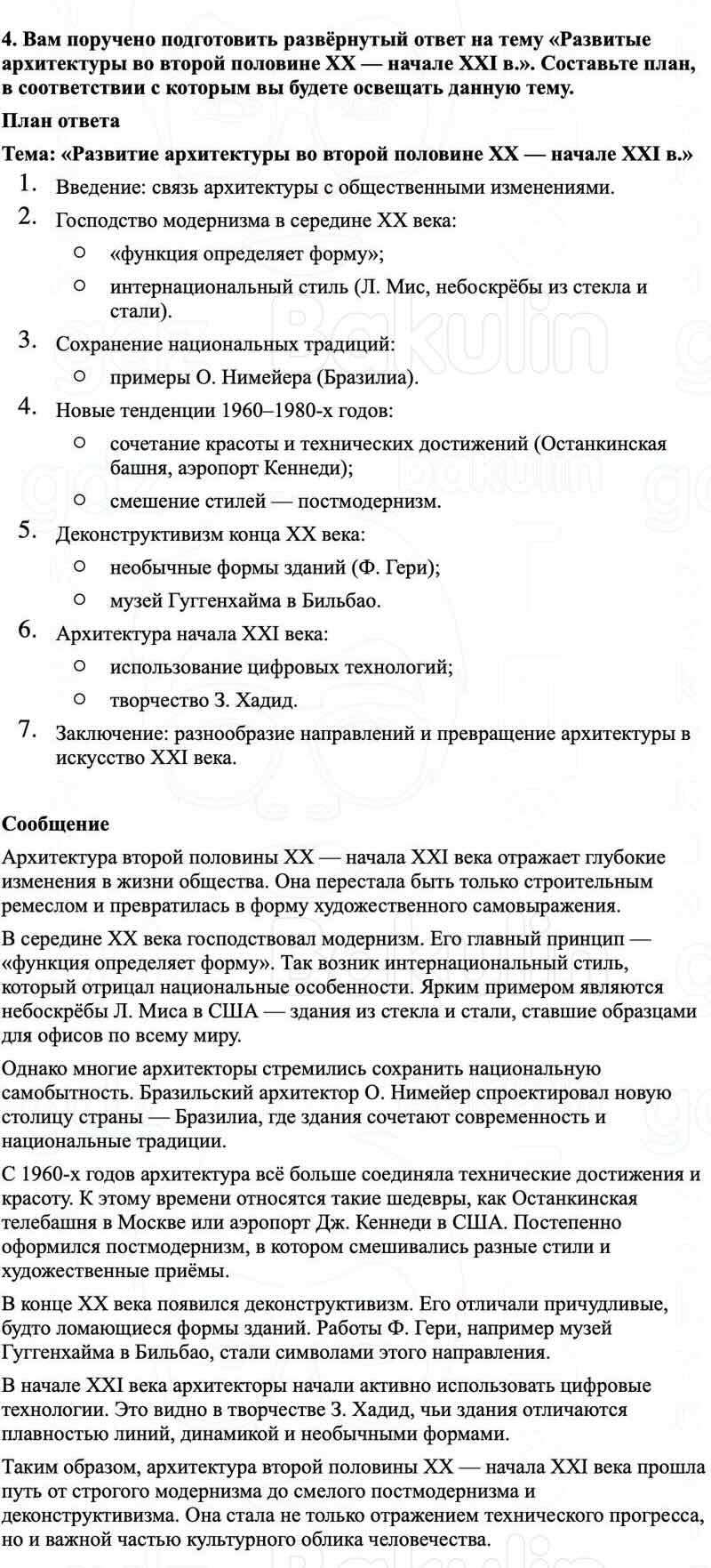 - Вам поручено подготовить развёрнутый ответ на тему «Развитые архитектуры во второй половине ХХ — начале XXI в.». Составьте план, в соответствии с которым вы будете освещать данную тему.