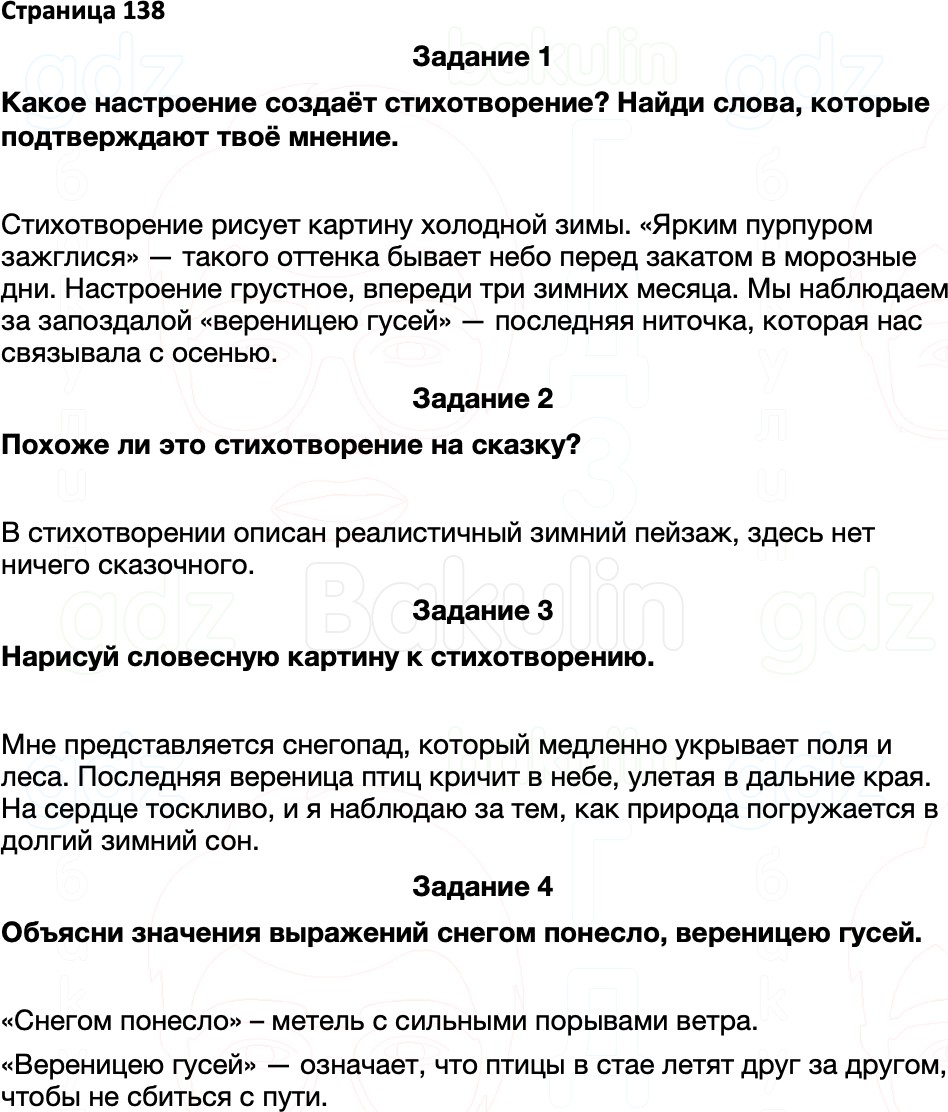 1. Какое настроение создаёт стихотворение? Найди слова, которые подтверждают твоё мнение. 2. Похоже ли это стихотворение на сказку? 3. Нарисуй словесную картину к стихотворению. 4. Объясни значения выражений снегом понесло, вереницею гусей.