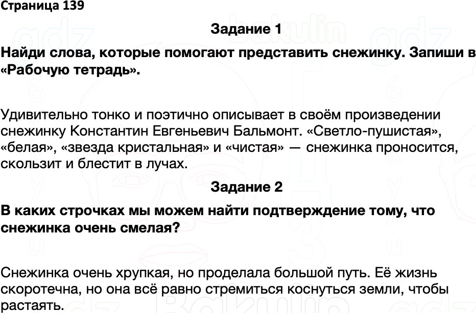 1. Найди слова, которые помогают представить снежинку. Запиши в “Рабочую тетрадь”. 2. В каких строчках мы можем найти подтверждение тому, что снежинка очень смелая?