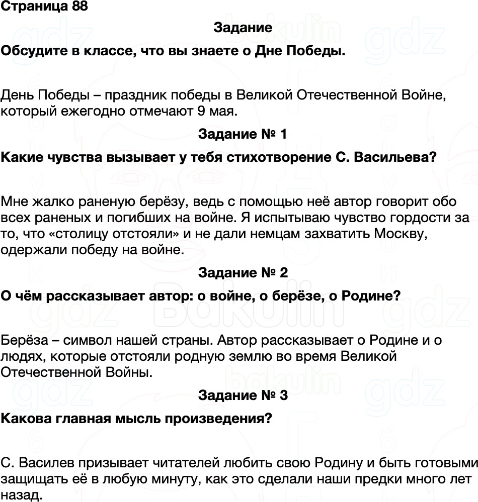 1. Какие чувства вызывает у тебя стихотворение С. Васильева? 2. О чём рассказывает автор: о войне, о берёзе, о Родине? 3. Какова главная мысль произведения?
