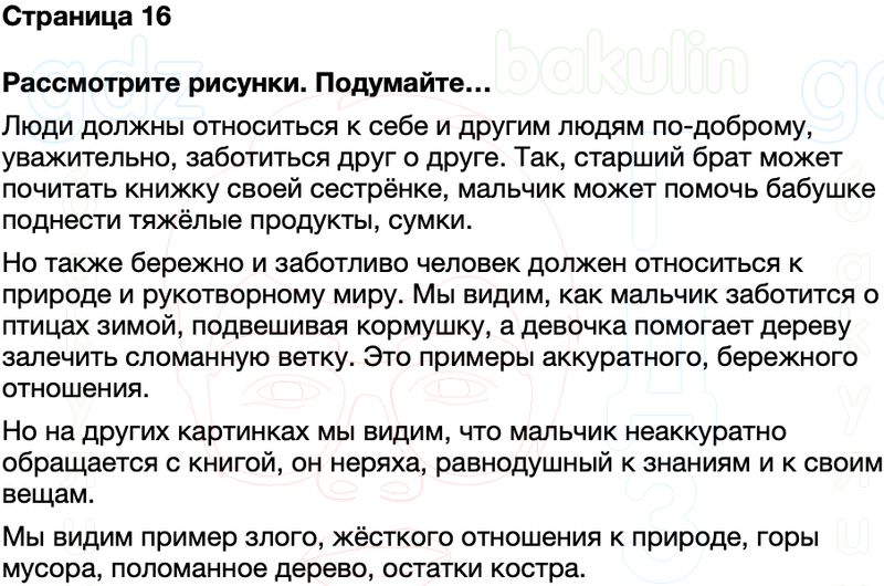 № 1. Рассмотрите рисунки. Подумайте и расскажите, каким может быть отношение человека: к себе, к другим людям и их мнению, к природе, к тому, что создано людьми. Для ответа используйте слова: доброе, злое, равнодушное, заинтересованное, жестокое, уважительное, бережное, заботливое, аккуратное.