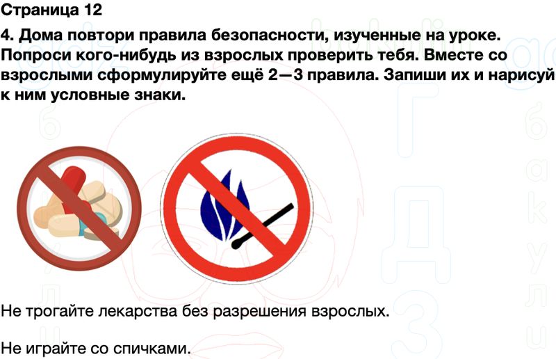 4. Дома повтори правила безопасности, изученные на уроке. Попроси кого-нибудь из взрослых проверить тебя. Вместе со взрослыми сформулируйте ещё 2—3 правила. Запиши их и нарисуй к ним условные знаки.
