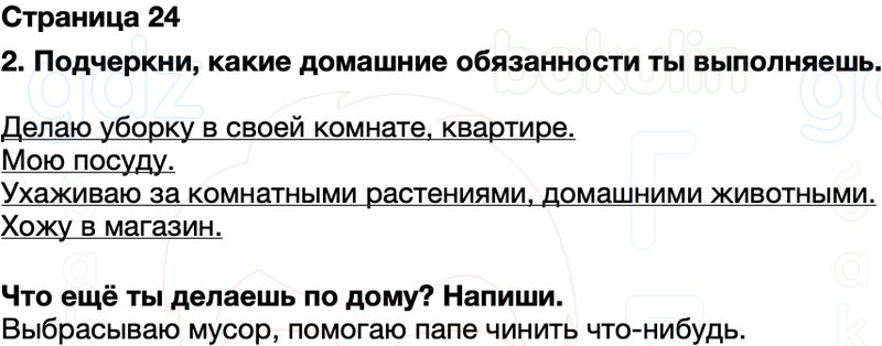 2. Подчеркни, какие домашние обязанности ты выполняешь.