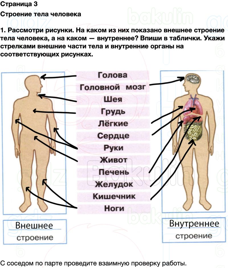 1. Рассмотри рисунки. На каком из них показано внешнее строение тела человека, а на каком — внутреннее? Впиши в таблички. Укажи стрелками внешние части тела и внутренние органы на соответствующих рисунках.