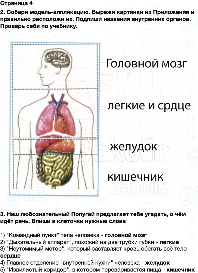 2. Собери модель-аппликацию. Вырежи картинки из Приложения и правильно расположи их. Подпиши названия внутренних органов. Проверь себя по учебнику.