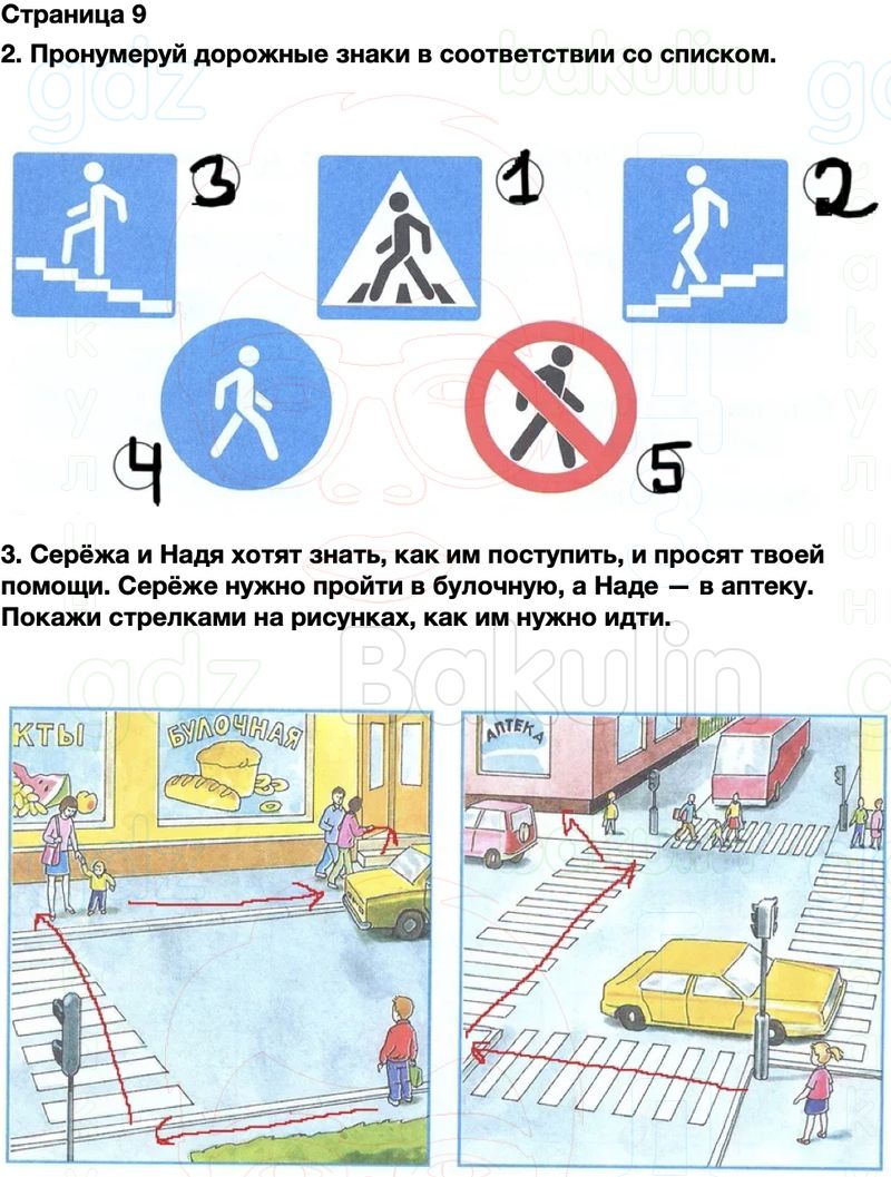 3. Серёжа и Надя хотят знать, как им поступить, и просят твоей помощи. Серёже нужно пройти в булочную, а Наде — в аптеку. Покажи стрелками на рисунках, как им нужно идти.