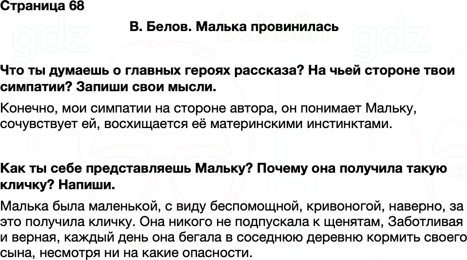 В. Белов "Малька провинилась" (стр. 68–69). Номер №2 Как ты себе представляешь Мальку? Почему она получила такую кличку? Напиши.
