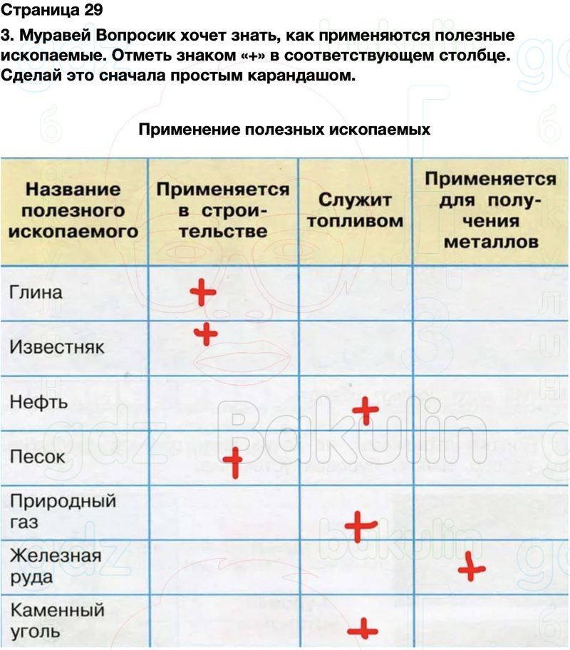 3. Муравей Вопросик хочет знать, как применяются полезные ископаемые. Отметь знаком «+» в соответствующем столбце. Сделай это сначала простым карандашом.