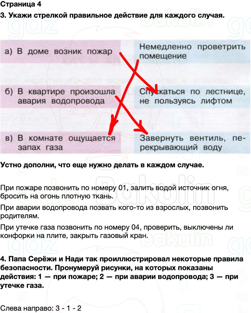 4. Папа Серёжи и Нади так проиллюстрировал некоторые правила безопасности. Пронумеруй рисунки, на которых показаны действия: 1 — при пожаре; 2 — при аварии водопровода; 3 — при утечке газа.