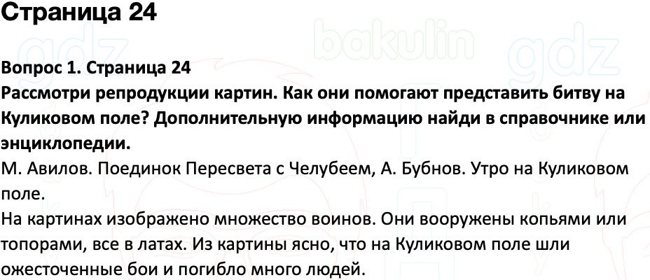 1. Рассмотри репродукции картин. Как они помогают представить битву на Куликовом поле? Дополнительную информацию найди в справочнике или энциклопедии.