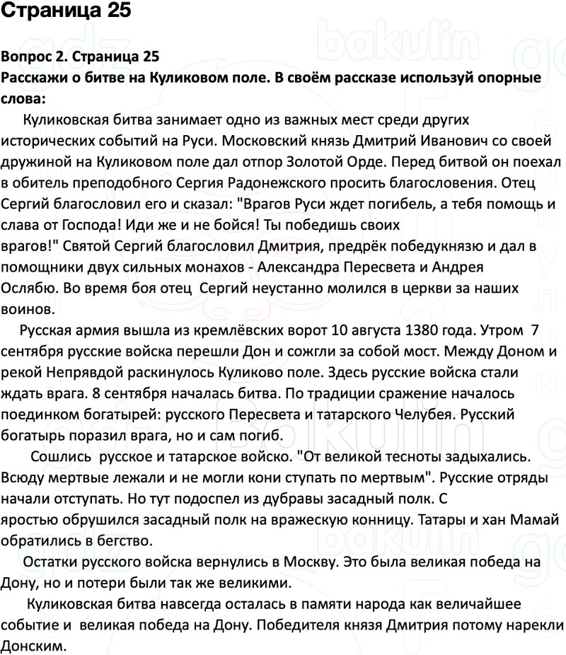2. Расскажи о битве на Куликовом поле. В своём рассказе используй опорные слова: московский князь Дмитрий Иванович, дать отпор Золотой Орде, долго готовился, просил благословения у Сергия Радонежского, святой предрёк победу, русская армия вышла из кремлёвских ворот 10 августа 1380 года, перешли Дон, засадный полк, 8 сентября началась битва, удар копья свалил князя, русские отряды начали отступать, вражеская конница, вступил в бой засадный полк, татары и хан Мамай обратились в бегство, великая победа на Дону.