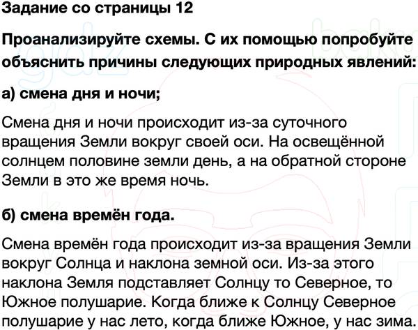 1. Проанализируйте схемы на с. 13. С их помощью попробуйте объяснить причины следующих природных явлений: а) смена дня и ночи; б) смена времён года. Проверьте себя по тексту учебника.