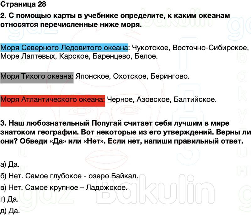 2. С помощью карты в учебнике определите, к каким океанам относятся перечисленные ниже моря.