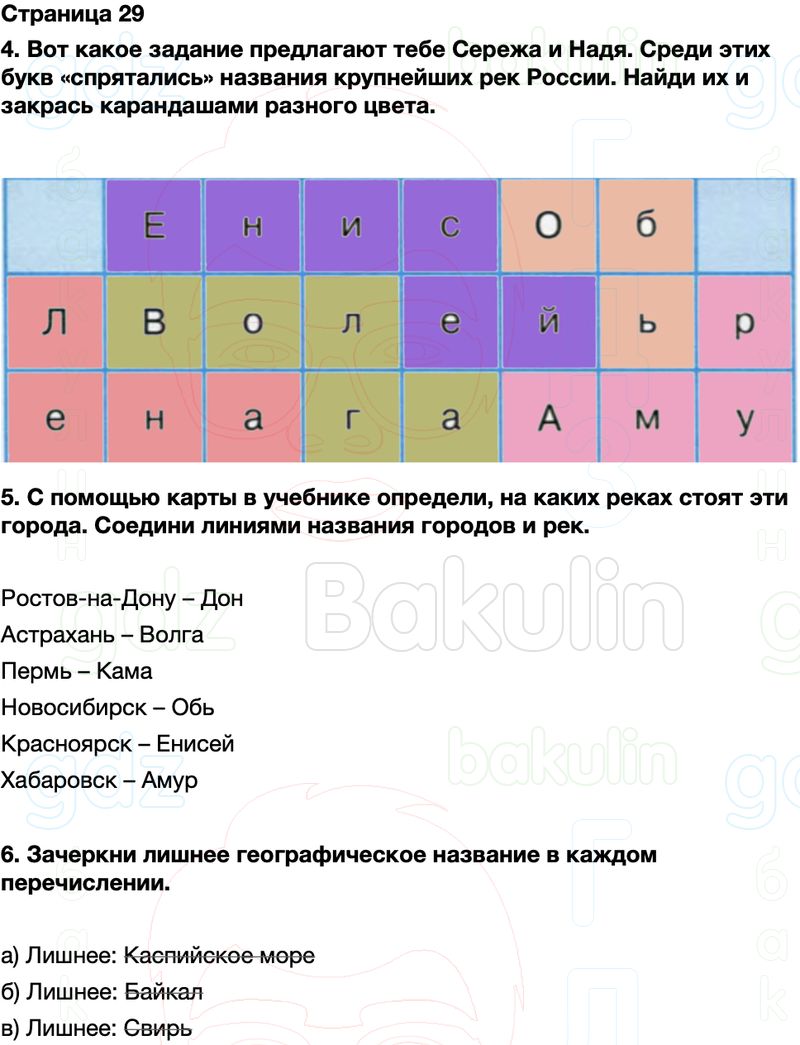 4. Среди этих букв «спрятались» названия крупнейших рек России. Найди их и закрась карандашами разного цвета.