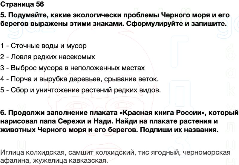 6. Продолжи заполнение плаката «Красная книга России», который нарисовал папа Сережи и Нади. Найди на плакате растения и животных Черного моря и его берегов. Подпиши их названия.